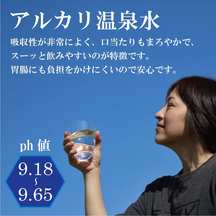 5:化粧水:天然シリカ74mg/l・メタケイ酸103mg/lを含有している超軟水。 コラーゲンの生成を助け、肌本来の潤いやハリを保ち、たるみやシワを防ぎます。 また、アトピー、過敏肌、乾燥肌のお方は、硬度の低い天然アルカリ温泉水を使って洗顔やスプレーすると メリットがあります。